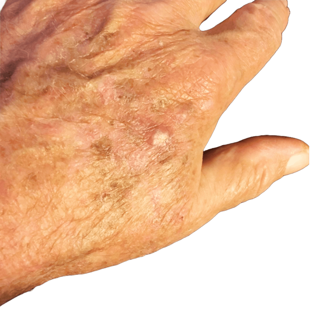 Ofta på solexponerade områden som ansiktet, händerna och hjässan