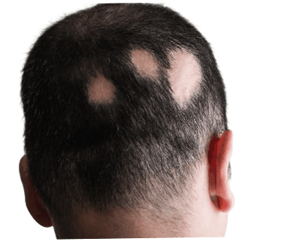Runda eller ovala kala fläckar: Oftast på huvudet, men kan även påverka skägg, ögonbryn eller andra kroppsdelar.