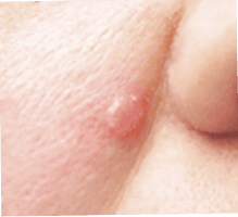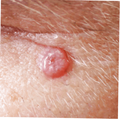Nodulär basalcellscancer: En hudfärgad eller rosa, glansig knuta med synliga små blodkärl. Det kan bildas ett sår och blöda.