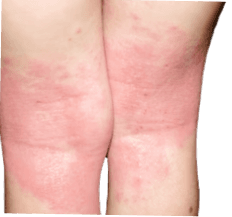 Psoriasis: En autoimmun sjukdom som ger tjocka, fjällande och röda hudförändringar. Psoriasis kan ibland förväxlas med eksem, men har en mer silveraktig fjällning och drabbar ofta områden som knän, armbågar och hårbotten.