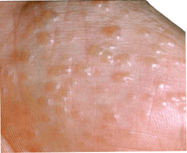 Blåsor: Små, vätskefyllda blåsor bildas oftast på sidorna av fingrar, tår, handflator och fotsulor. Dessa kan klia mycket och ibland vara smärtsamma framförallt om det bildas sprickor.