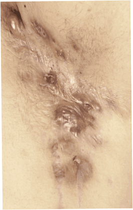 Abscesser: Infektioner som bildar varfyllda knölar. Abscesser är ofta isolerade tillvett visst område, och är inte kroniska som HS.
