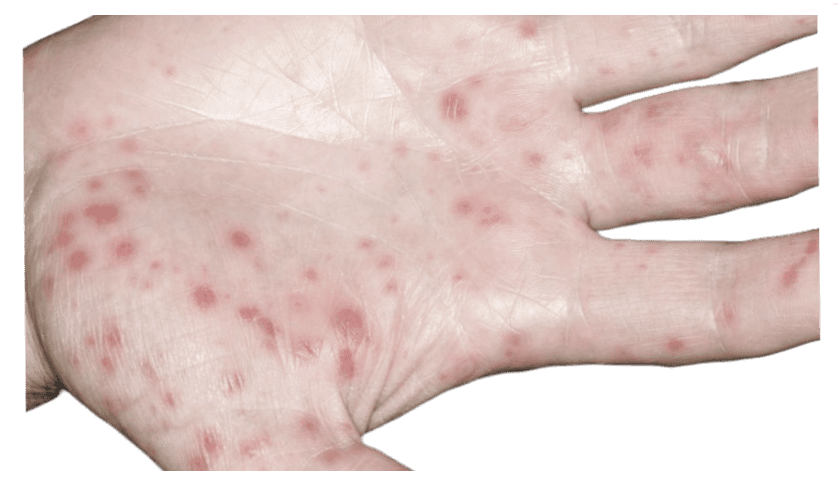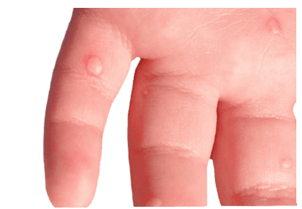 Blåsor på händer och fötter, inklusive handflator och fotsulor