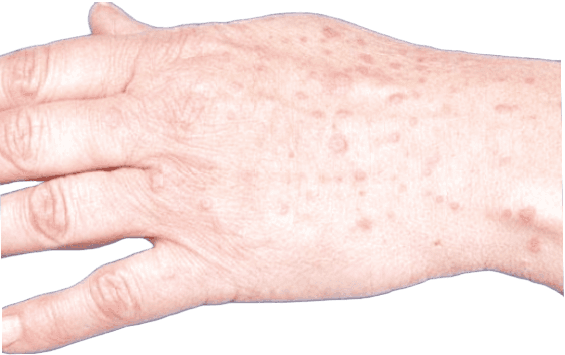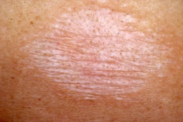 Vitaktiga, glänsande fläckar: Hudens yta kan se ut som pergamentpapper.