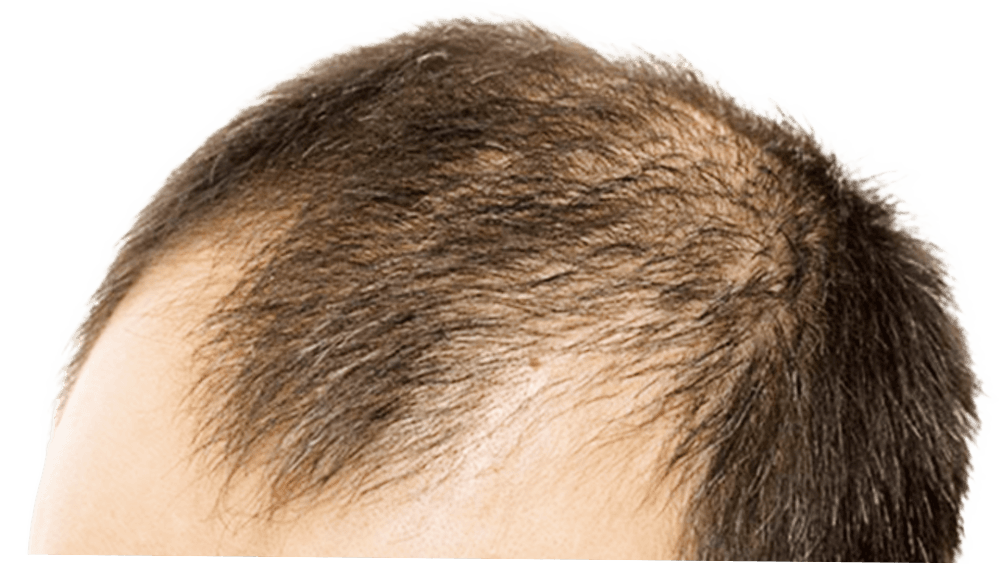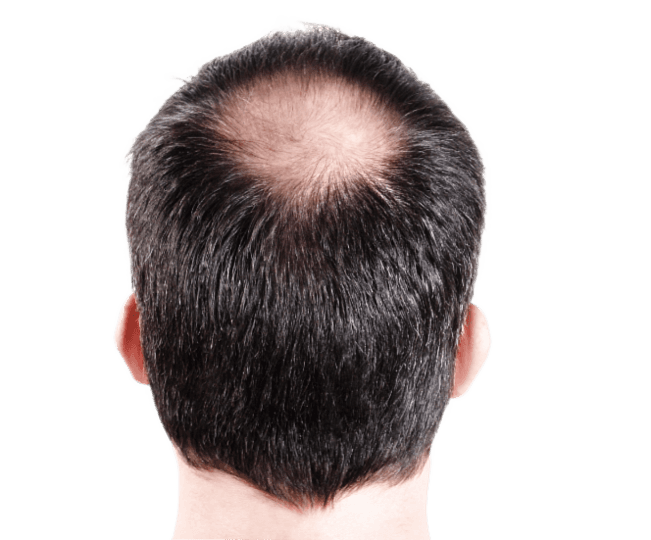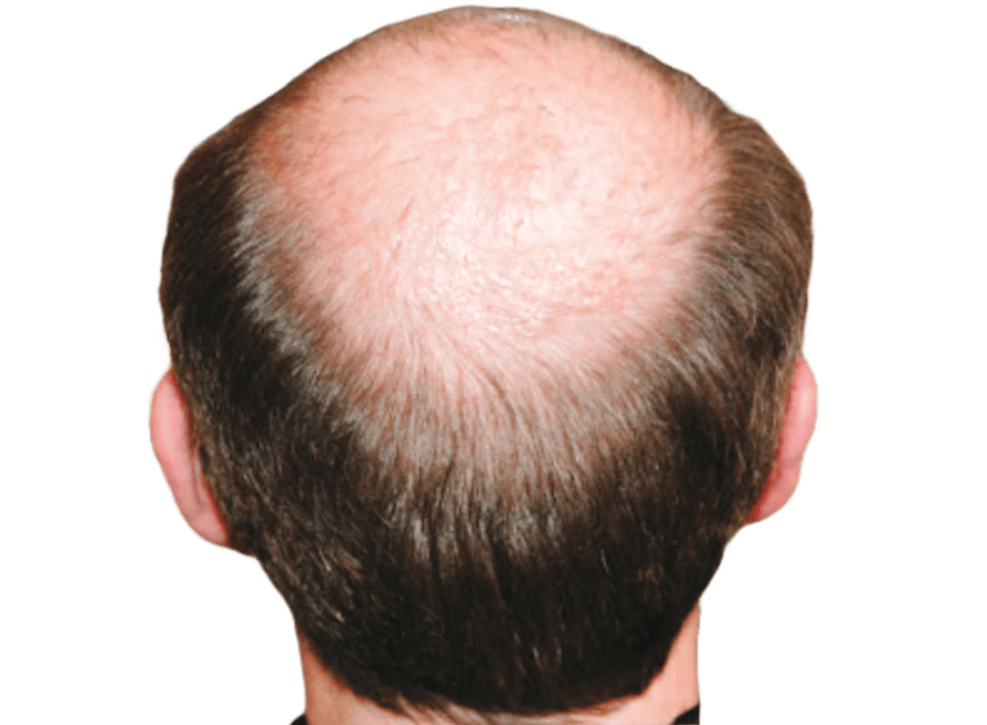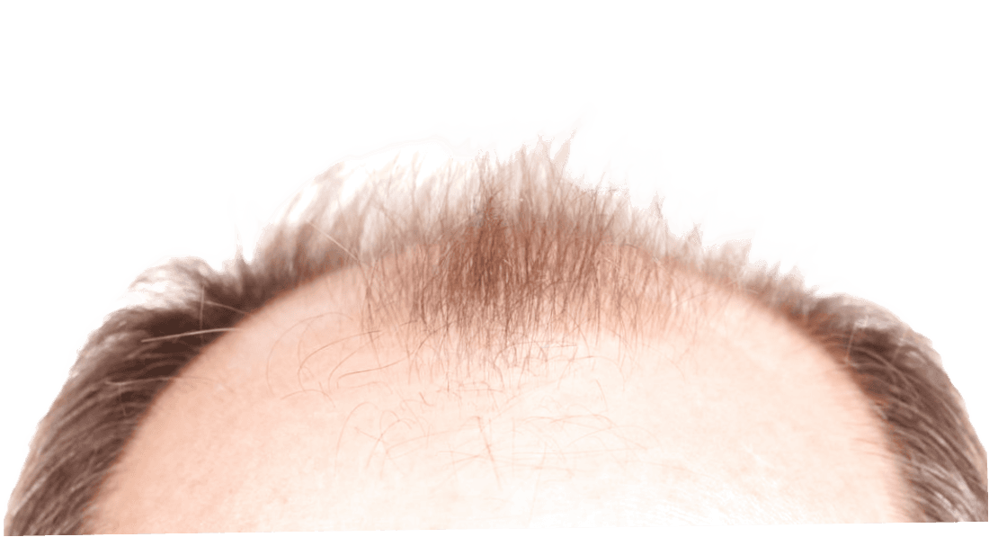 Tydligt håravfall: Mycket högt hårfäste, håret på hjässan är borta.
