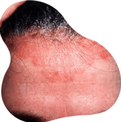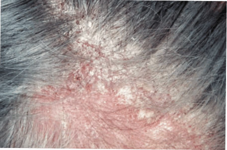 Fläckvisa eller utbredda eksem i hårområdet: Eksemet kan även sprida sig till bröstet, öronen eller pannan (se bild ovan).