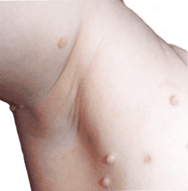 Födelsemärken: Upphöjda pigmentfläckar som ibland liknar mollusker men oftare är bruna eller svarta.