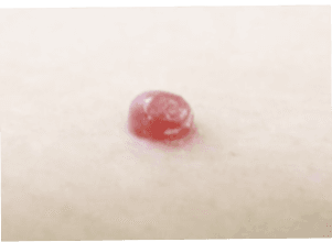 Ibland en gulaktig eller brunaktig skorpa om den har blött tidigare.
