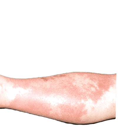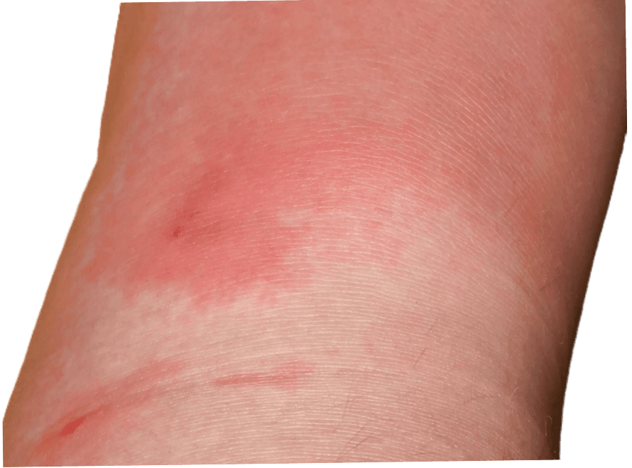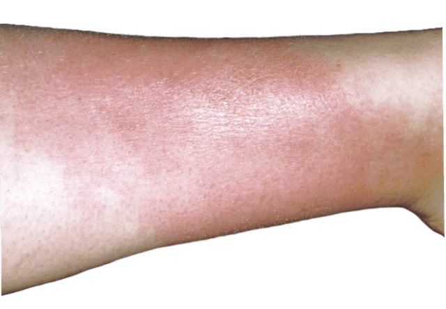 Intensiv rodnad i huden som sprider sig, ofta med en tydlig gräns. Rodnaden kan vara svår att upptäcka på mörk hud.