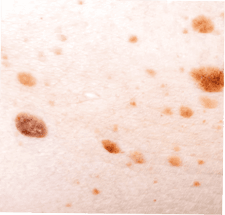 Upphöjda, välavgränsade hudförändringar som kan vara ljusbruna, mörkbruna eller svarta.