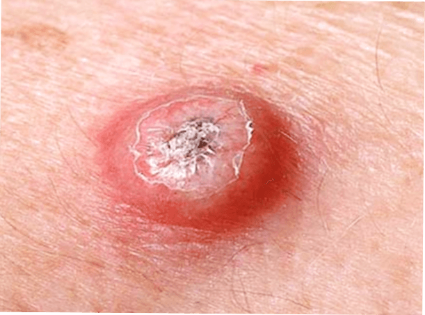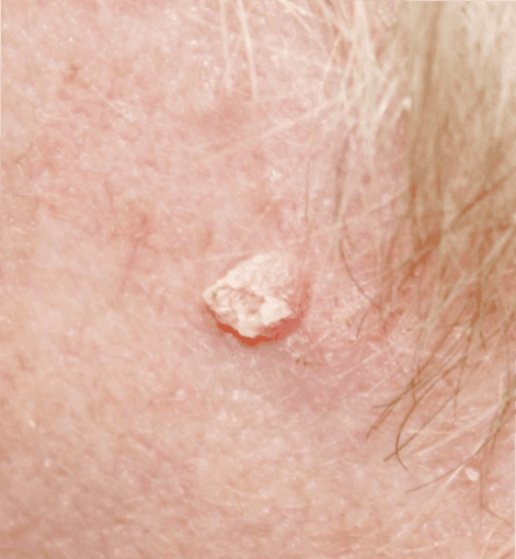 Keratoakantom: En snabbt växande, kupolformad knuta med en central krater (grop) eller hudhorn. Den kan ibland försvinna av sig själv men på grund av vi inte vet vilka som försvinner av sig själva bör behandlas som en invasiv skivepitelcancer.