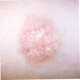 En röd, fjällande eller skrovlig fläck som inte försvinner.