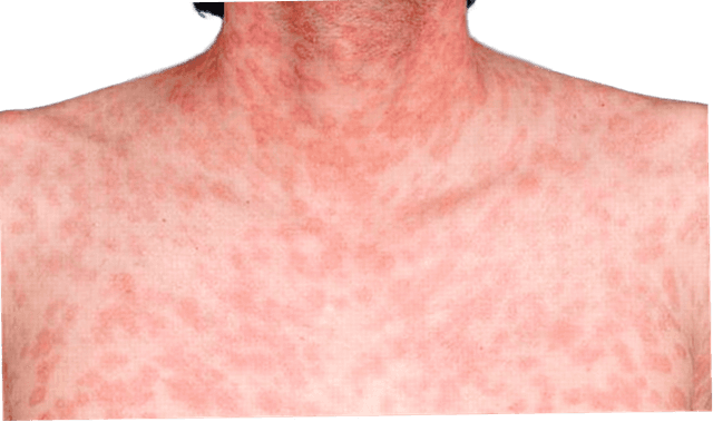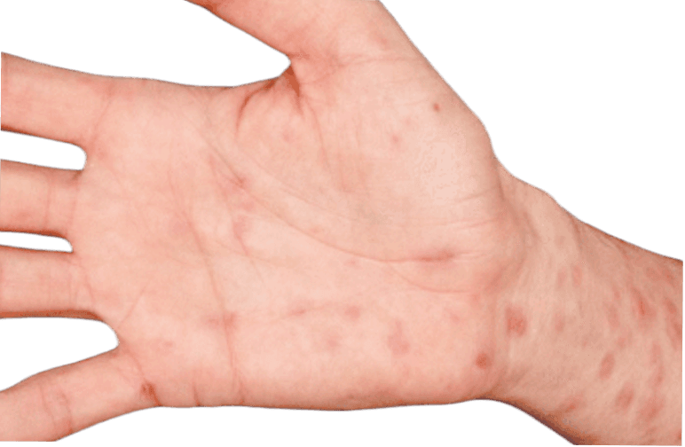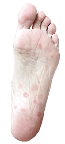Utslag, särskilt på handflator och fotsulor.